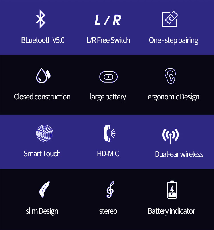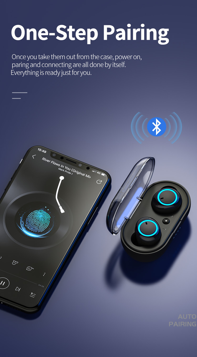 Bluetooth twins earbuds which is lightweight and highly ergonomic, making it comfortable to wear for extended periods of time. It uses Bluetooth 5.0 that gives a stronger signal for the great wireless audio experience over a larger operating distance, enjoy the music life.