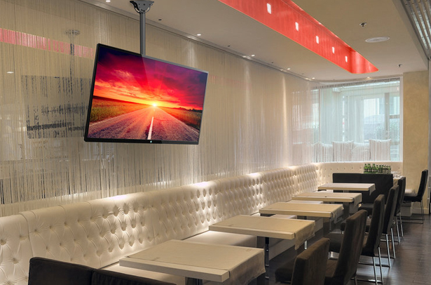 This ceiling mount bracket is designed to hold a 23 inch to 42 inch flat screen displays with a maximum VESA hole pattern of 600x400. It can be mounted on a flat or beveled ceiling. It offers a 25° downward tilt and a 180° swivel in either direction. It also has built in cable management. It is typically used in retail and commercial settings.