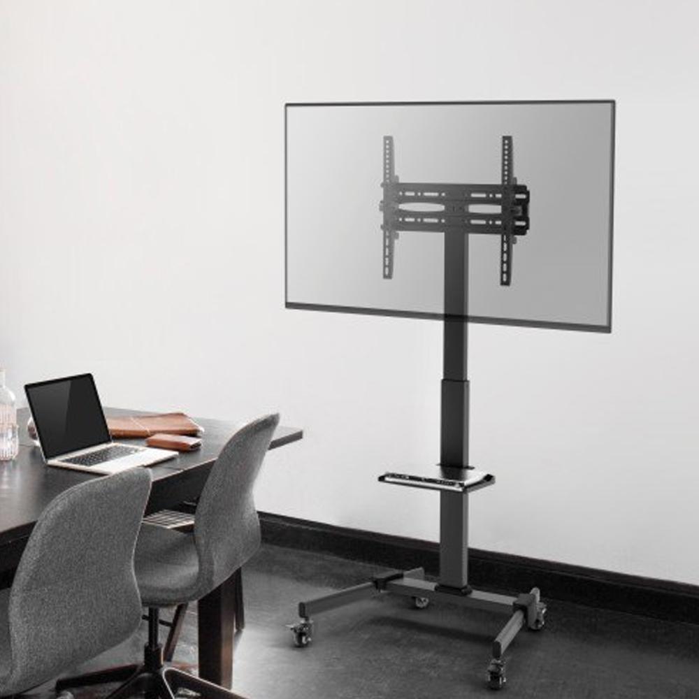 This rolling TV cart fits TV sizes from 32 inch to 55 inch and also has space for a device such as a DVD or a camera. It has built in cable management, adjustable height and allows the TV to tilt without the use of a tool. Ideal for office and educational usages.